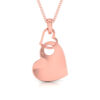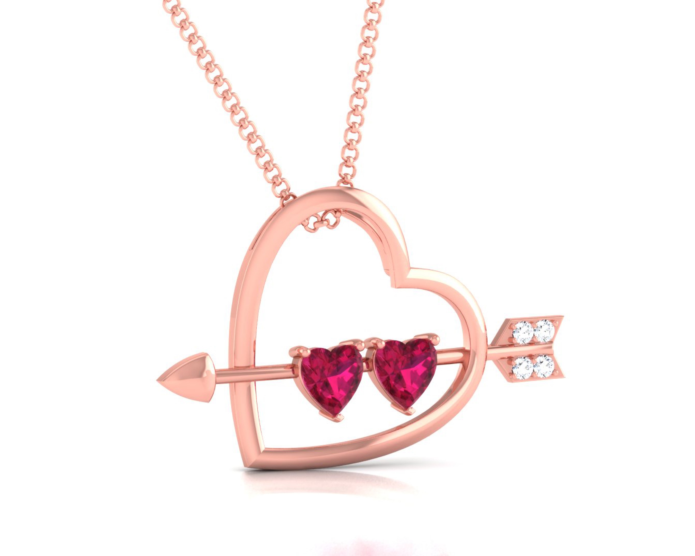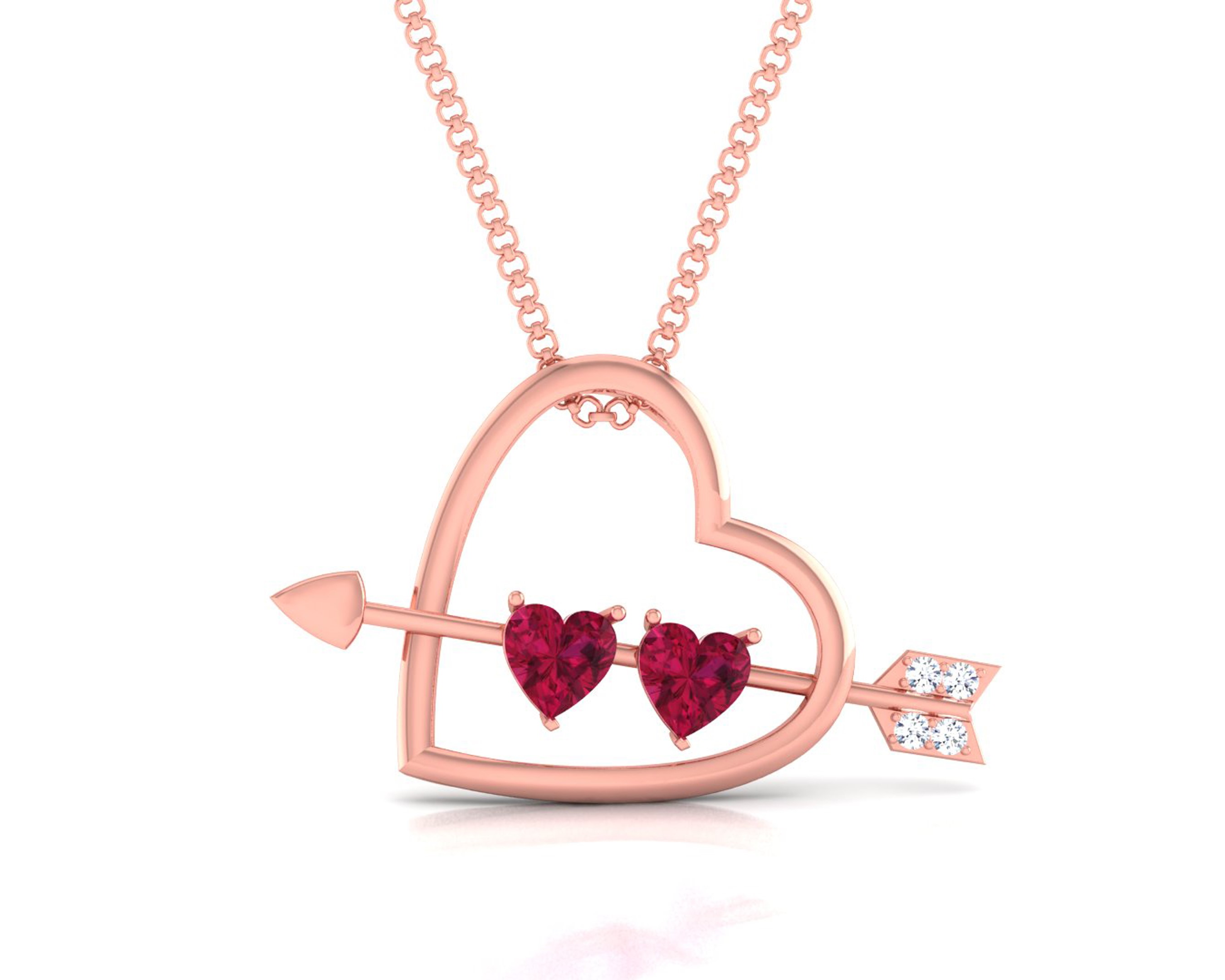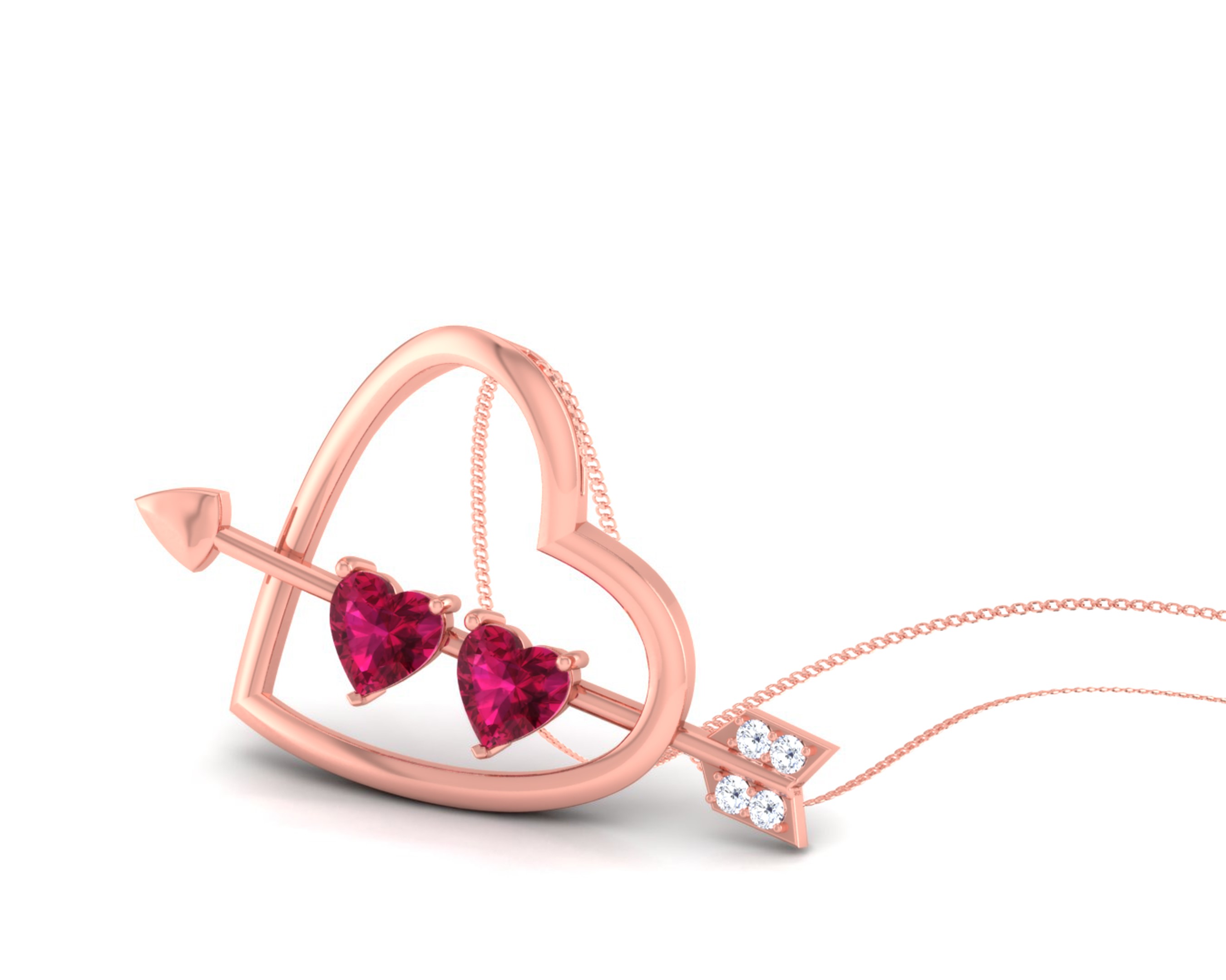 A delicate rose gold heart pierced with an arrow, featuring two ruby hearts symbolizing eternal love. The arrow’s tip and fletching are accented with diamonds, adding a sparkling touch to this romantic pendant