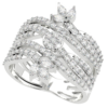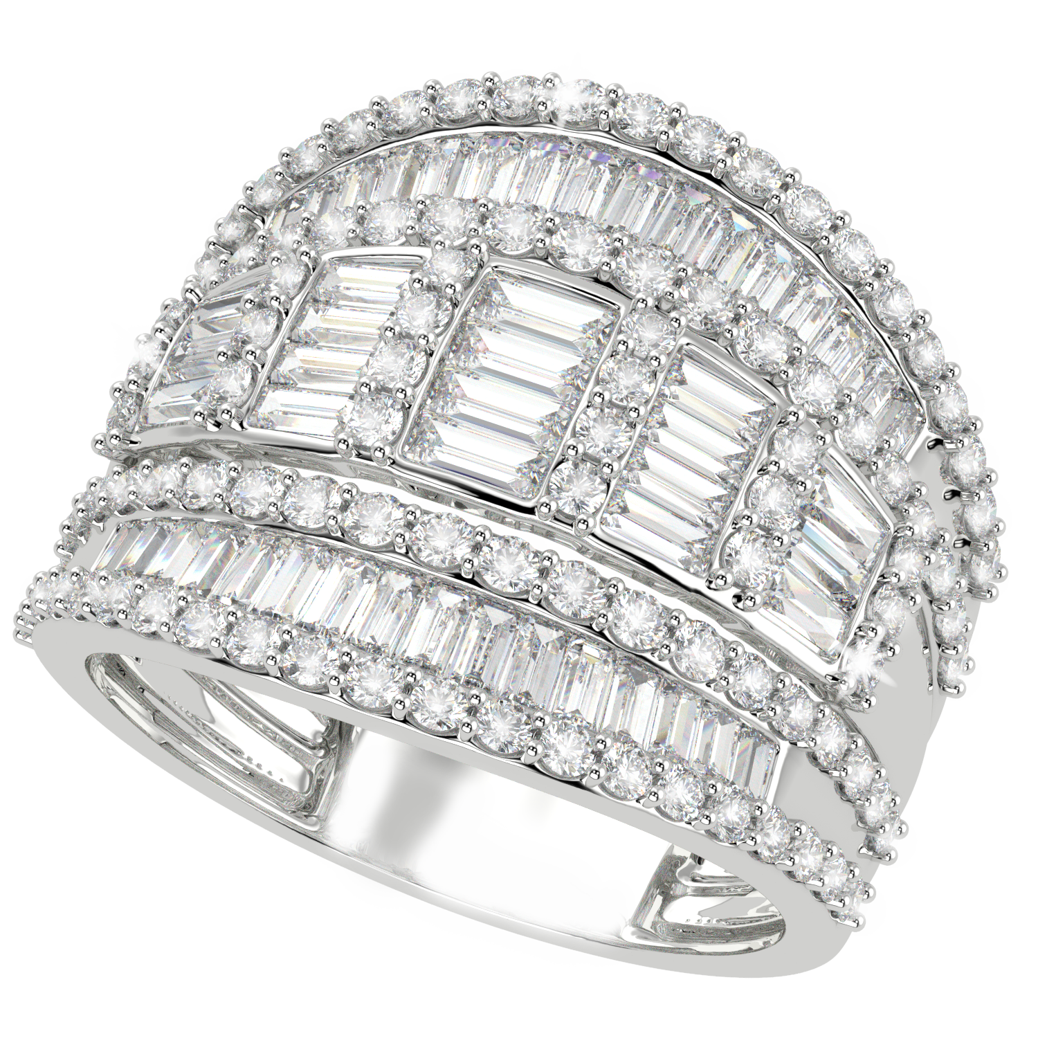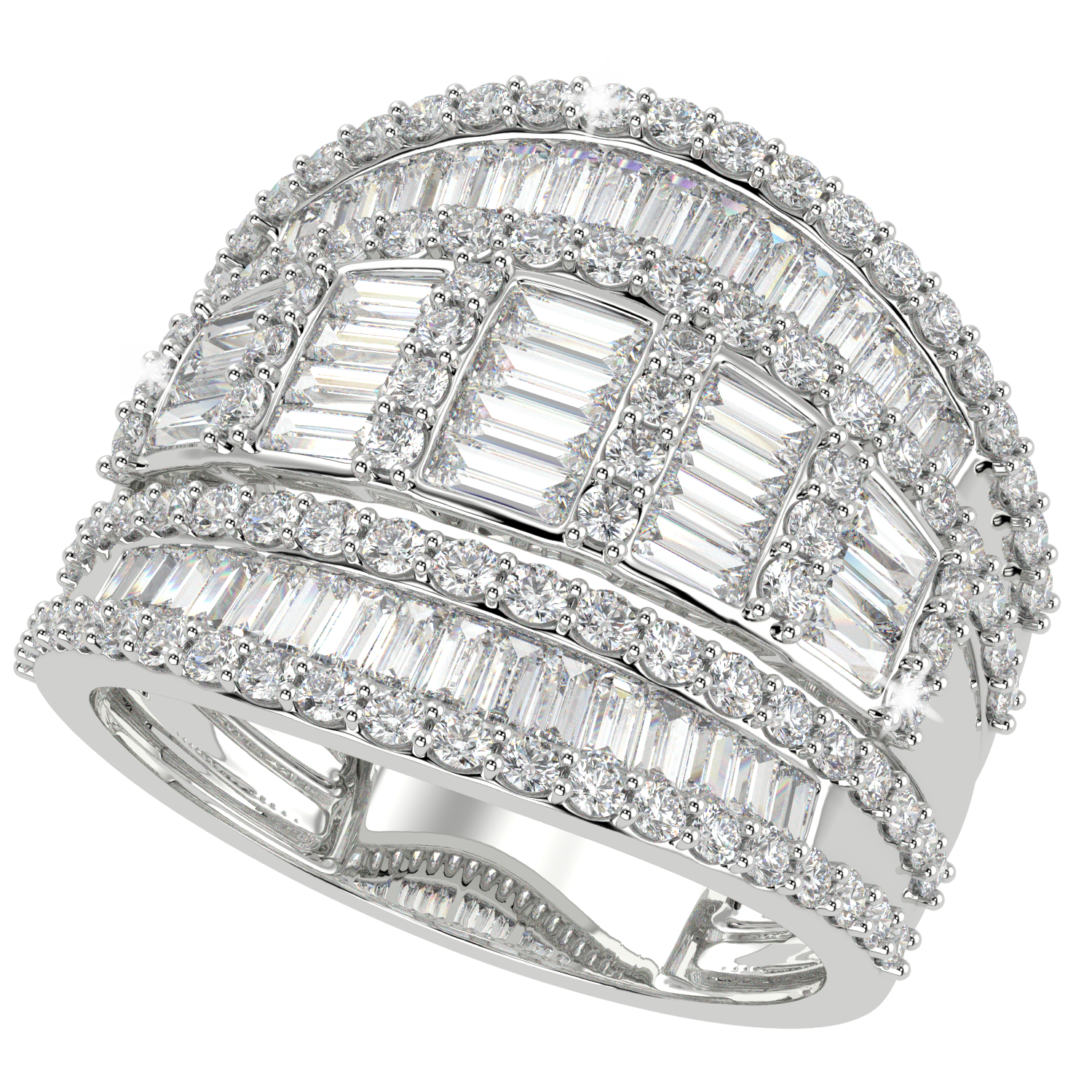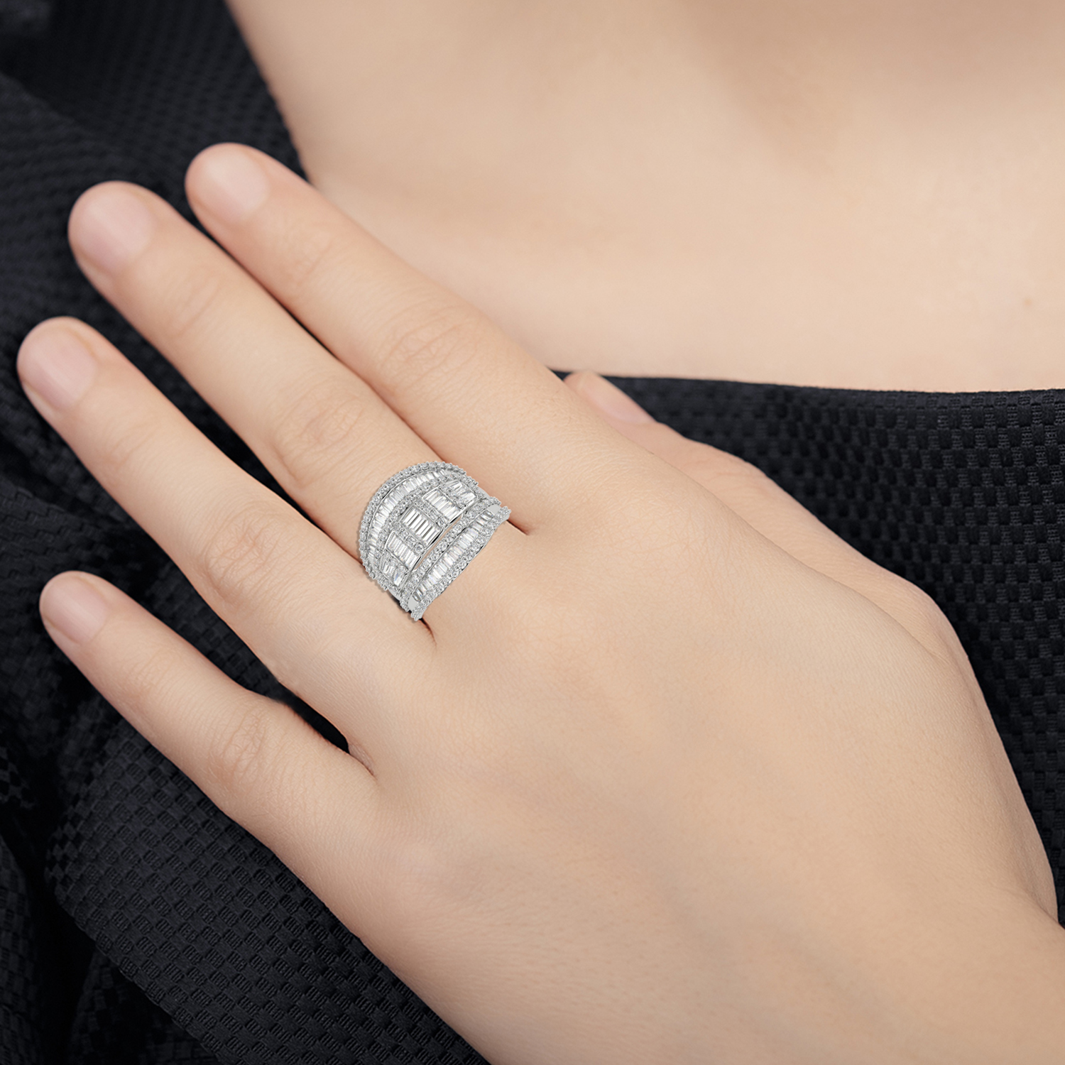 A bold, sophisticated wide-band ring with baguette and round-cut diamonds in a structured, geometric pattern, radiating sheer opulence and grandeur.