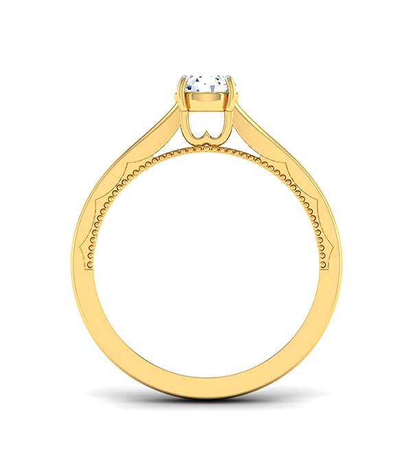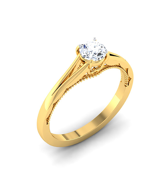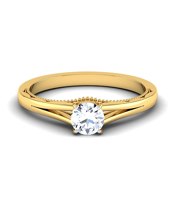A timeless symbol of elegance, this solitaire engagement ring features a brilliant round-cut diamond set in a refined yellow gold band. The delicate milgrain detailing along the sides adds a touch of vintage charm, while the sleek, polished design ensures a modern yet classic appeal. With its graceful curves and sophisticated simplicity, this ring beautifully represents a love that is pure and everlasting