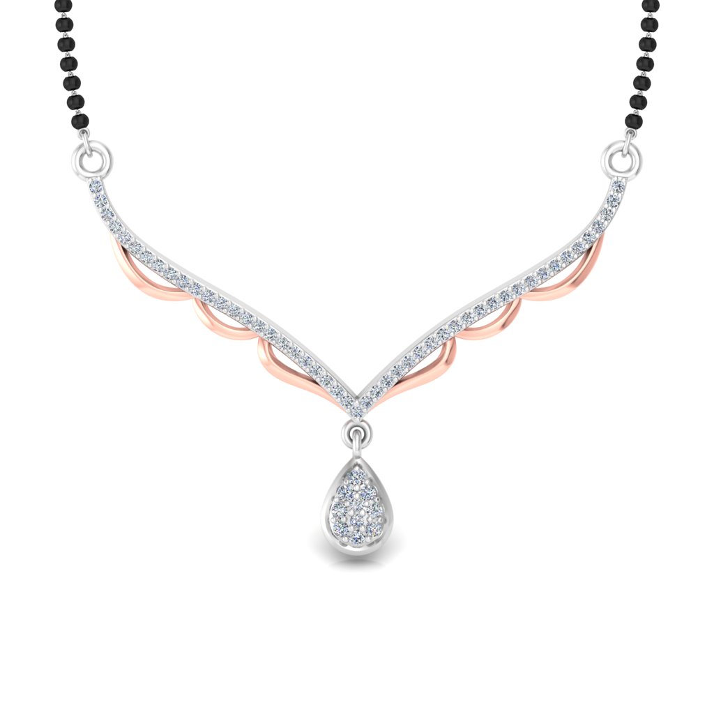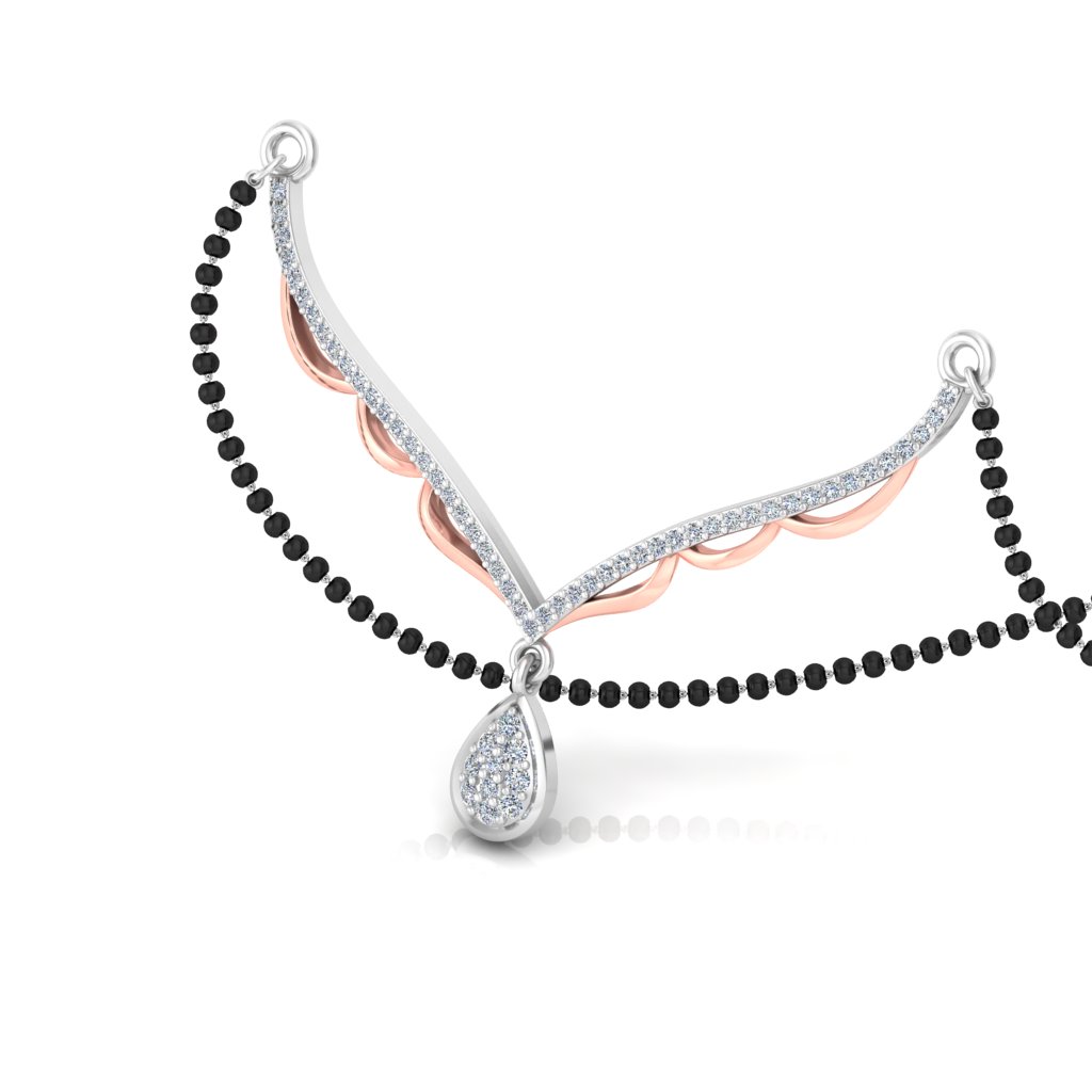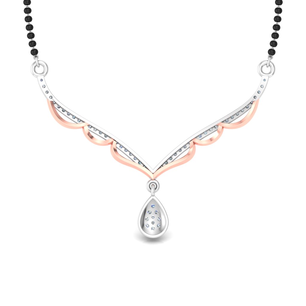A stunning fusion of modern artistry and tradition, this mangalsutra showcases a delicate V-shaped design with shimmering diamonds set in gold. Accentuated by rose gold curves, it features a graceful teardrop pendant, symbolizing eternal beauty.