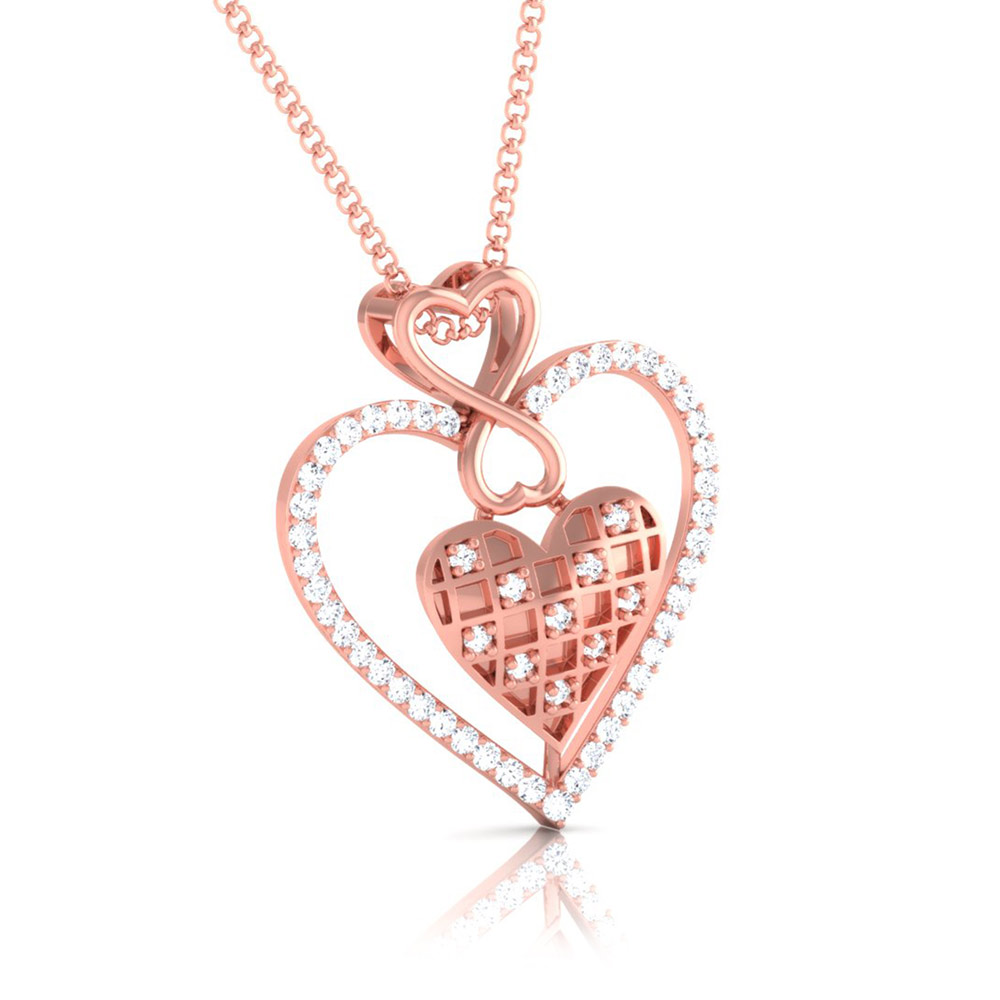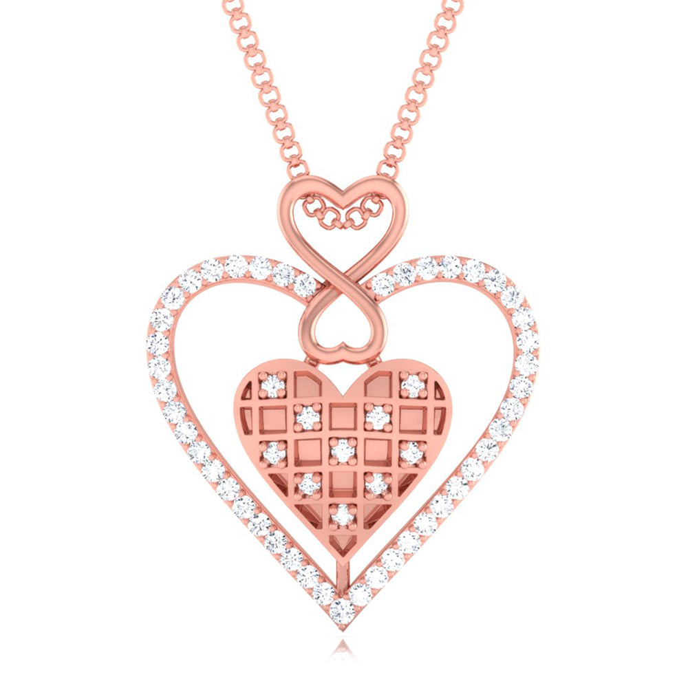 This stunning pendant showcases an infinity heart entwined with a sparkling diamond-studded frame. The lattice heart centerpiece, adorned with petite diamonds, symbolizes eternal love and commitment. A breathtaking piece for someone truly special.