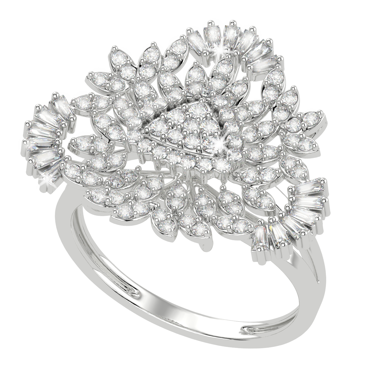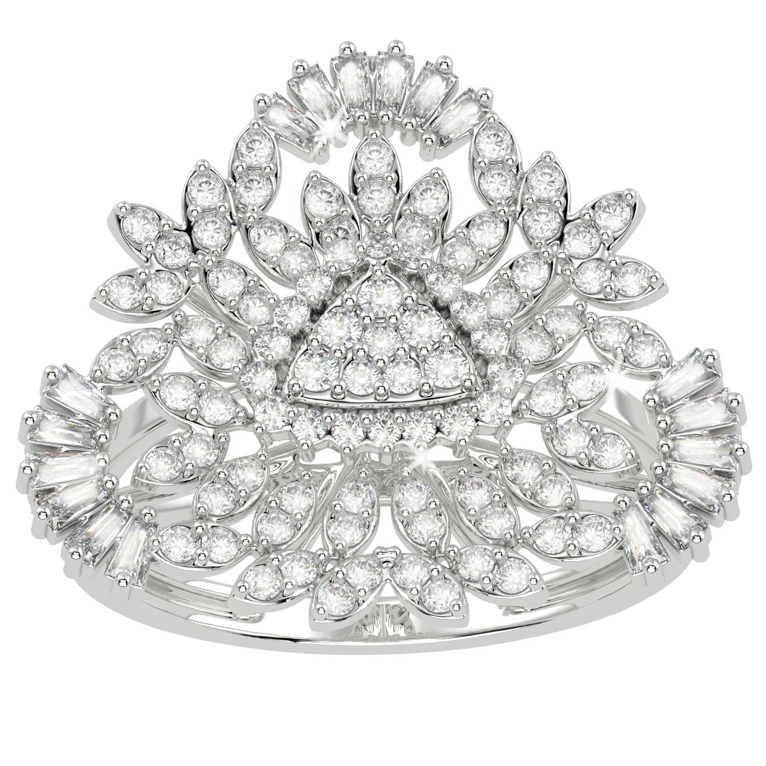 A contemporary design symbolizing freedom and grace, this ring features fluid diamond-studded arcs resembling fluttering wings. The sleek baguette and round diamonds add movement and brilliance to the piece.