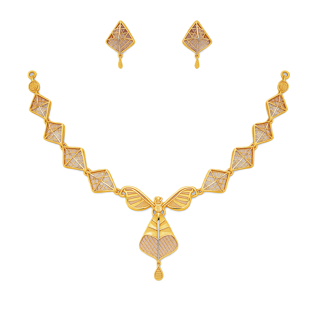 A celebration of nature’s elegance, this necklace set features diamond-patterned links and a central honeybee motif in gold and silver tones. Perfect for unique festive flair, it adds charm, whimsy, and artistry to any ensemble.