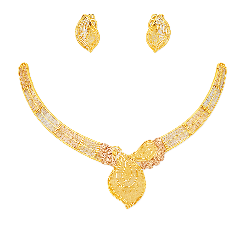 Inspired by nature’s poetry, this gold necklace set features an artistic leaf motif centerpiece with intricate lattice work in tricolor tones. A refined blend of elegance and tradition, perfect for cultural celebrations and statement occasions.