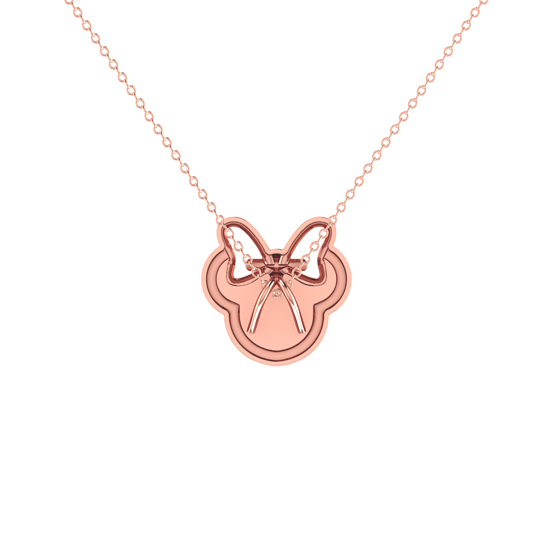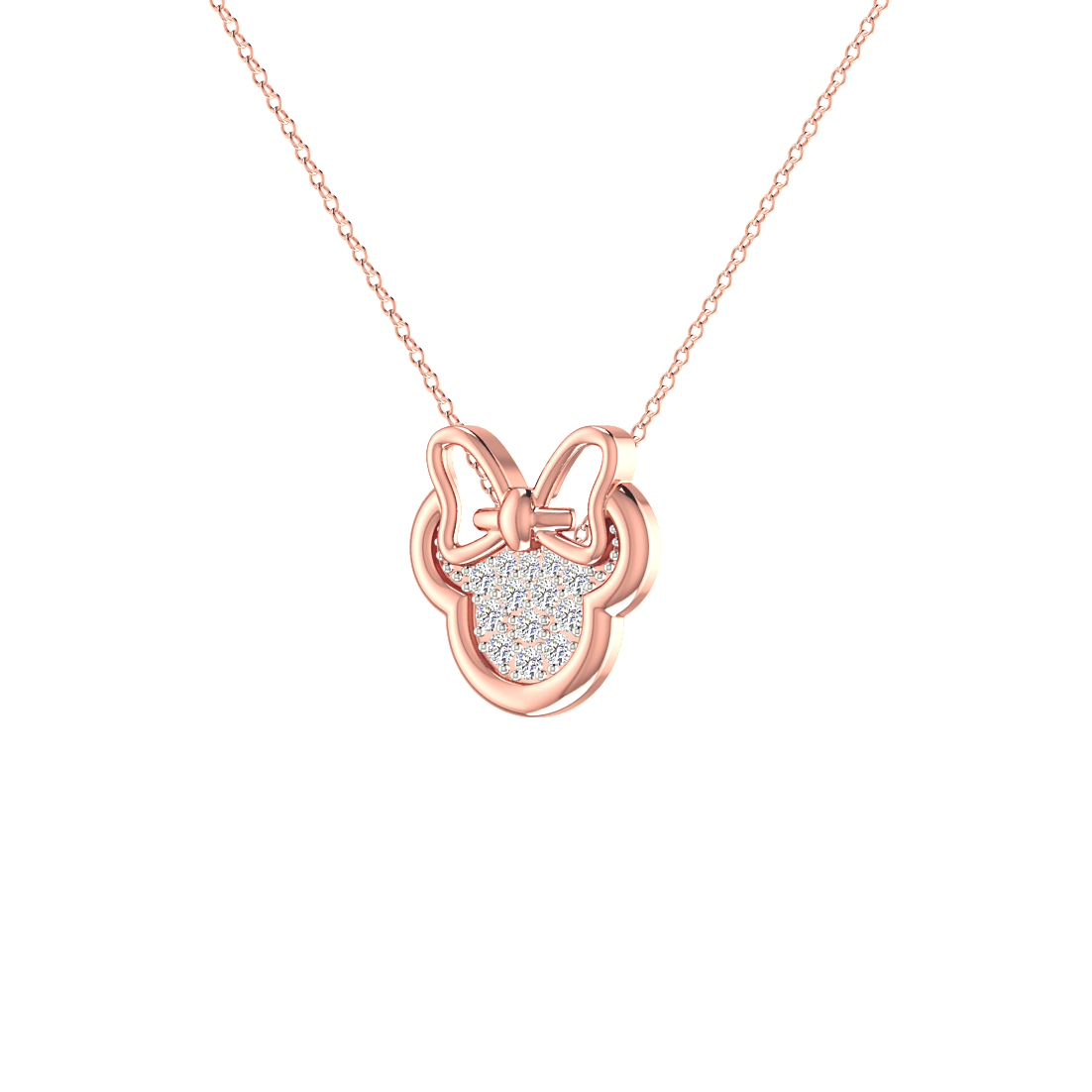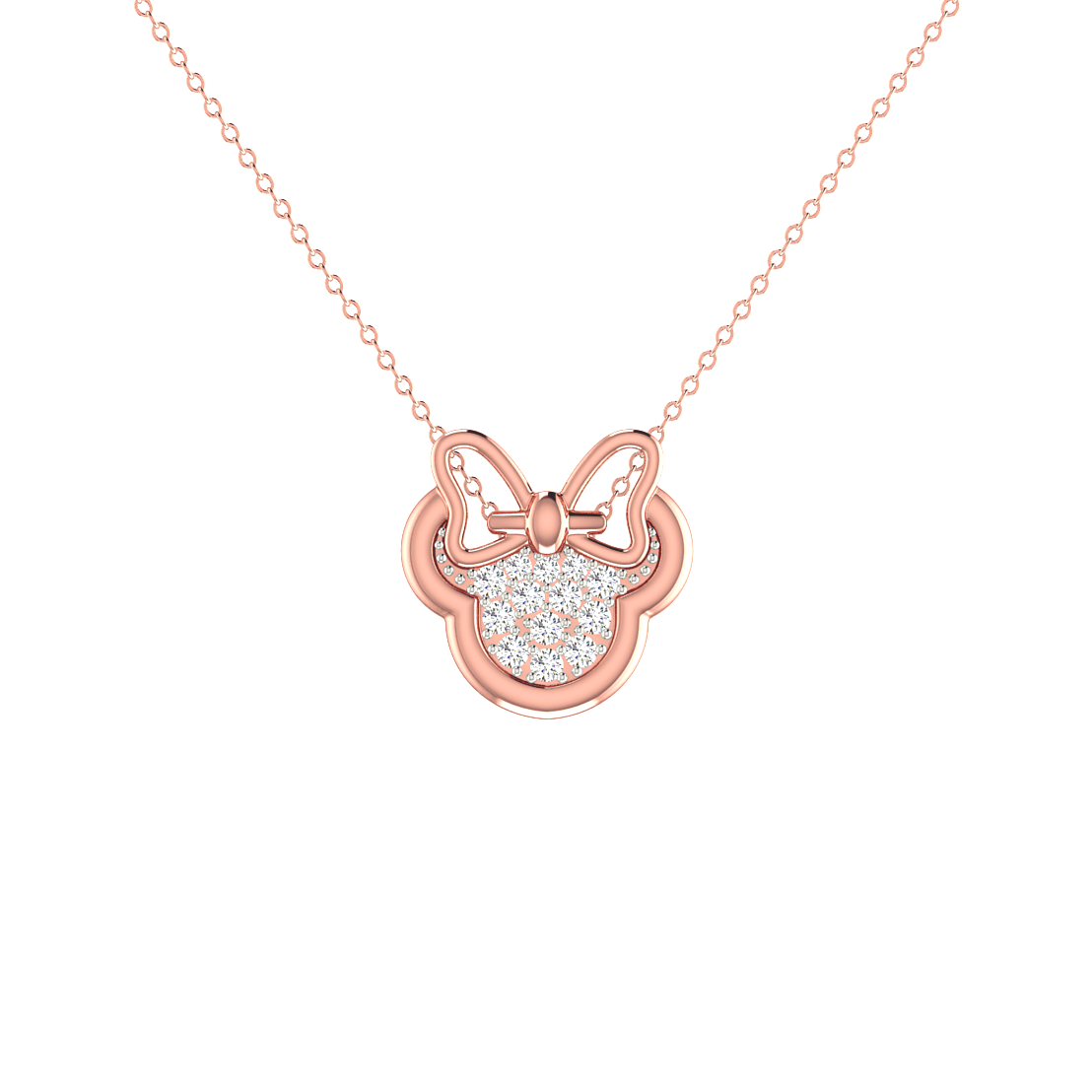A delightful Minnie-inspired pendant in rose gold, encrusted with shimmering diamonds. The elegant bow adds a playful yet sophisticated touch, making it perfect for everyday wear.