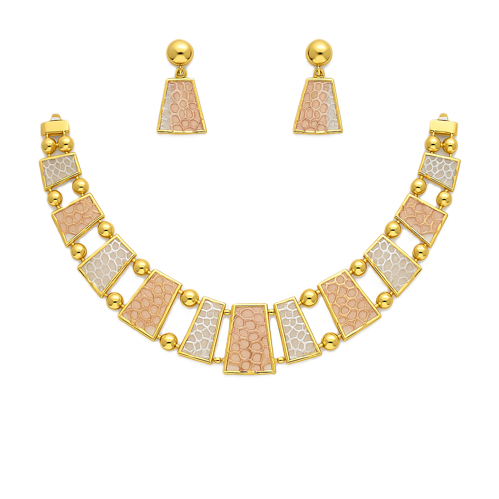 This contemporary necklace set features trapezoid-shaped links with embossed textures in rose gold and silver tones, accented by gold beads. A bold and stylish choice for modern occasions, blending geometric charm with artistic flair.