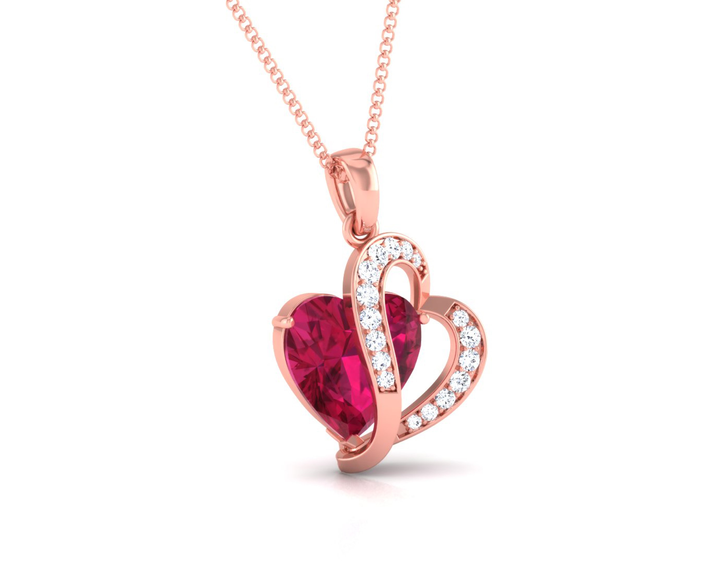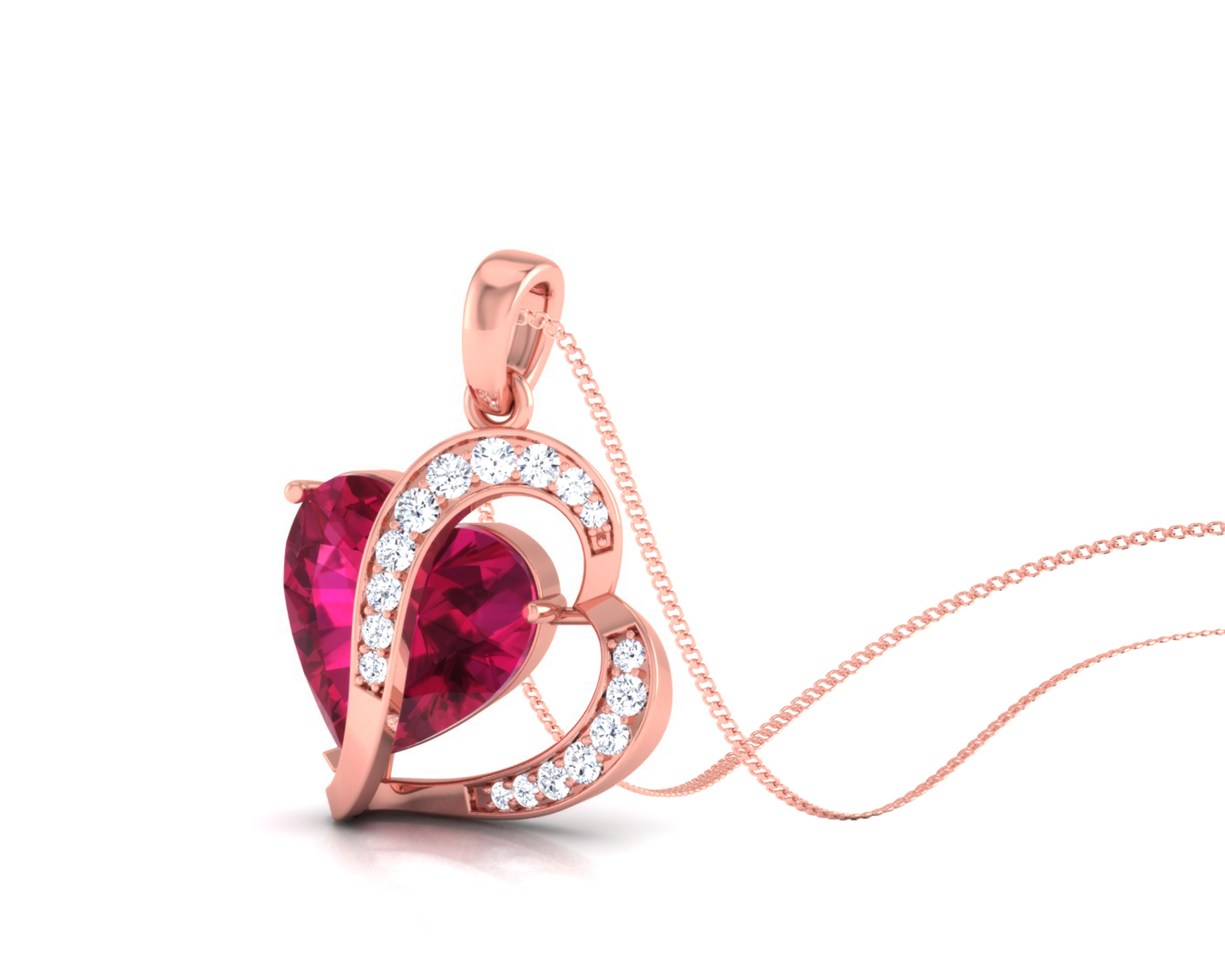 A rose gold pendant with a vibrant red heart-shaped gemstone encased in a