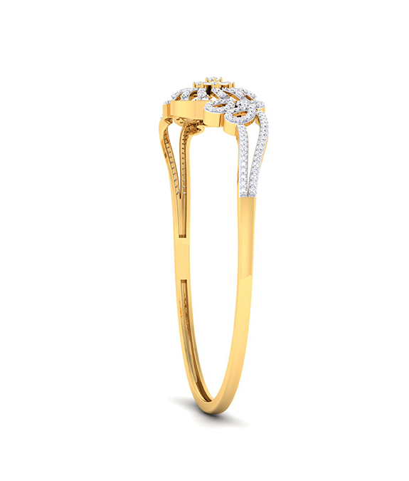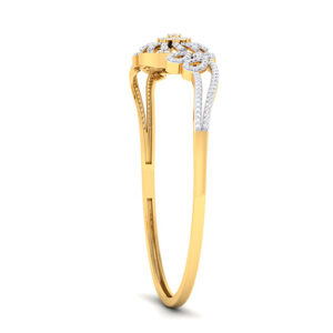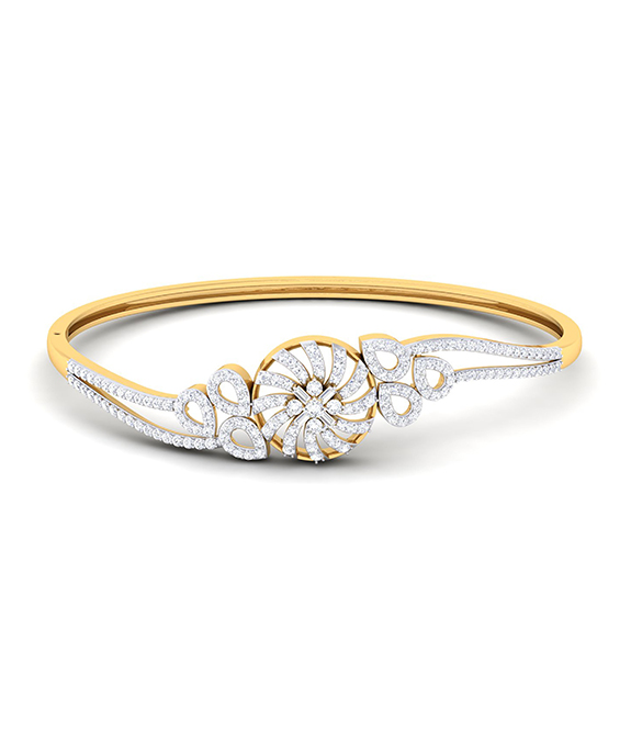 The Blossom Swirl Diamond Bangle is a stunning fusion of floral elegance and artistic craftsmanship. Crafted in yellow gold, this bangle features a captivating spiral bloom centerpiece, radiating brilliance with pavé-set diamonds. The delicate petal-like loops on either side add a graceful touch, symbolizing beauty in motion. The dual-line diamond-studded frame enhances its luxurious appeal, making it an exquisite piece for both grand occasions and everyday glamour. A perfect blend of sophistication and charm, this bangle is a true statement of timeless elegance.