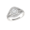 A unique, futuristic solitaire design featuring a bezel-set diamond encircled by delicate pavé diamonds, representing the beauty of celestial orbits. This avant-garde ring seamlessly blends modern aesthetics with the eternal allure of diamonds, making it a statement of individuality.